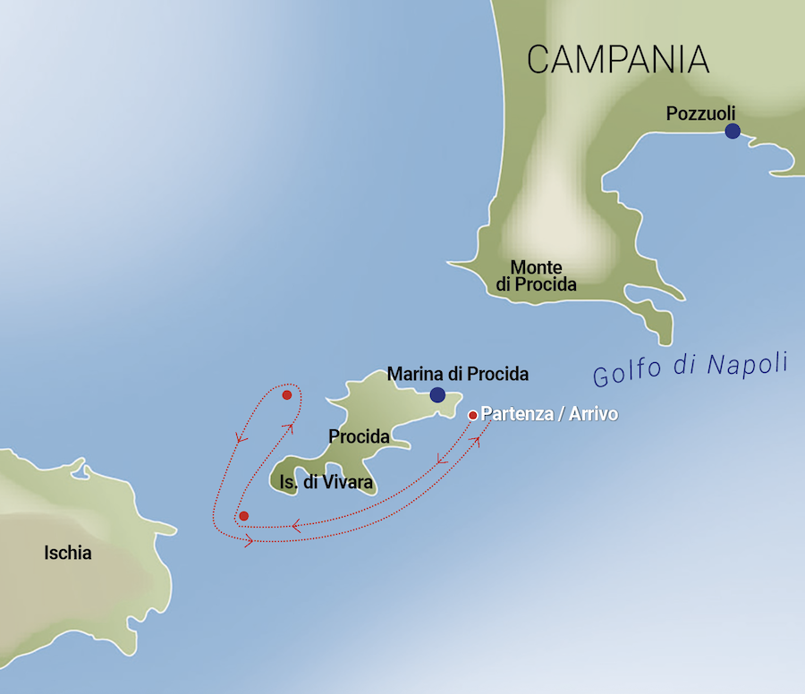 The course of the VELA Cup Procida, a regatta for all that takes place on Saturday, September 27, organized in collaboration with the Municipality of Procida and the local Lega Navale, is perhaps the most evocative of the circuit. Once you leave Marina di Procida you reach the starting line, in front of the ancient fortress of Palazzo D’Avalos built in the 1500s. We head south, passing in front of the spectacular Marina Corricella, a bay that is home to the oldest fishing village on the island of Procida with its small houses all in different colors. The regatta proceeds following the outline of the island, ascending after passing theisland of Vivara to Punta Serra, in front of the Spiaggia del Postino, where one of the most beautiful scenes of the iconic last film with Massimo Troisi was filmed. The course then includes the return, after turning the buoy, with the start line turning into the finish line. Total: about 10 miles of coastal racing along the southwest coast of the island of Procida.