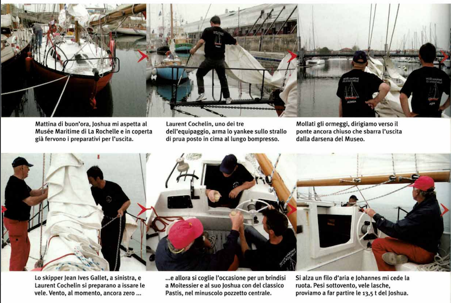 Meanwhile,Patrick Schnepp, director of the museum and a longtime friend of Moitessier‘s, arrives. It is to him that we owe the initiative to bring back to France Joshua. In 1990 he managed to get it resold by an American lady who in turn had bought it from Joe and Neto, the two young men to whom Bernard, left penniless, had given it after it was shipwrecked on the coast of Mexico. Moitessier had supported the idea, collaborating in restoring Joshua as it was in his day, including the two masts made from telegraph poles. He had dictated, however, “not to set her up like a trophy in a bottle, but free on the sea with new sails.” Schnepp kept his promise. Joshua already for years has been available to the public (for contacts www.museemaritimelarochelle.fr), when he is not engaged in the circuit of historic boat races including the very famous one held in Brest. We are about to cast off our moorings but from the dock a woman shouts at the top of her lungs to stop. It is Isabelle Autissier who has to do some filming with French TV operators at the interior of Joshua. Of course, back up and tops tightened again. Isabelle is at home on Joshua, from time to time she comes to rim it, to sail on it and would like to do so again today. But journalistic duty calls her elsewhere. After a good quarter of an hour we manage to cast off our moorings again and motor toward the dock exit. First bridge, then the second, we pass between the two ancient towers of La Rochelle harbor and arrive in the open sea. Wind at the moment zero, however we hoist the sails: main, mizzen, both with three hands of reefing, yankee and foresail, also reefable. All new but as at the time very heavy, the lightest being of 10-ounce fabric. And to think in his early years, including those that took him from the Mediterranean to Tahiti and then the terrible return via Cape Horn, Joshua sailed without halyard winches or sheets. Bernard capped the sails with flying hoists, and it was not until the Globe Challenge, the first ’68 edition of the nonstop round-the-world race (today’s Vendée Globe), that the boat was fitted with four winches donated by Goiot, two of which are still aboard. Instead, the winches remained for the main and mizzen sheets, two for each sail so the leech could be better adjusted upwind. The engine, which is not the original 7 hp but a more modern 40 hp, stops mumbling and we stand still in the silence of a somewhat misty atmosphere. We have all morning to spare, sooner or later some air will rise! Meanwhile, glasses go up from underneath, 10 a.m. toasting Moitessier with Pastis, all four of us gathered in this tiny cockpit with high, admittedly uncomfortable backs.