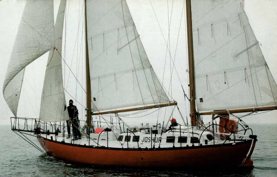 I start looking around, observing the boat in detail. The first one that jumps out at me is the wheel steering circuit, with the brakes running free on the deck. A system as simple as it is effective. “Bernard originally thought of it that way for the inside wheel,” says Johannes, who got to know Moitessier and sail with him , “then he added this second wheel in the cockpit.” Meanwhile, a breeze picked up. 5/6 knots from the southwest. Johannes leaves me the wheel. In spite of its 13.5 tons displacement and its wet surface, as well as a fixed three-blade propeller that is a plow, the boat begins to move with surprising ‘agility. Then again, there is plenty of canvas; the mainmast is 16 meters high from the water’s surface, and to this must be added the mizzen mast, for a total of almost 110 square meters of sail area upwind. So much, to the point that the designer himself had expressed some misgivings about her maneuverability when solo. But Bernard had been adamant on this aspect: “maximum canvas and fractional sails.” With the result that Joshua is a very physical boat. “I wonder how he could handle her alone,” Jean Ives tells me , “when it’s windy we struggle to carry her in three.” And indeed maneuvering four sails without any aids (see furling) and with minimal equipment. must be no joke. On the choice of ketch rigging, Bernard will in time reconsider: “If I were to rig Joshua again … it would be a cutter,” he writes in Tamata and the Alliance , “less burdens and weights up top, a freer deck, better upwind performance …” Yeah, upwind. The feeling I get at the helm is not of a very upwind boat. Then again, in addition to the ketch rig, there is a relatively low drift plane, intended to be able to enter the “passe” of the Polynesian islands. The boat fishes meters 1.60, and it is known that a shallow keel is not the best for going upwind. As for course stability, though, hard to get better. If I leave the wheel Joshua goes straight as a spindle, and this, especially for a boat designed to sail with a windward rudder, is an essential peculiarity. That of Joshua was a small flettner, a kind of airplane flap, mounted on the same blade as the rudder. There are still flettners. Upwind wide toward theIle de Re, Joshua spins at 4 1/2 knots in 7 to 8 knots of wind. He comes alongside a Dufour 38, greets us and attempts to overtake. He will need a good half hour to catch our bow. He speeds up and slows down on every slight change in the wind, while we keep going at the same pace. On the way back to La Rochelle, Jean Ives tells me that the week before there was a regatta with a sudden 50-knot gust of wind. Some boats dismasted, others broke sails and equipment. Joshua made it to the finish line intact. And first in his class.