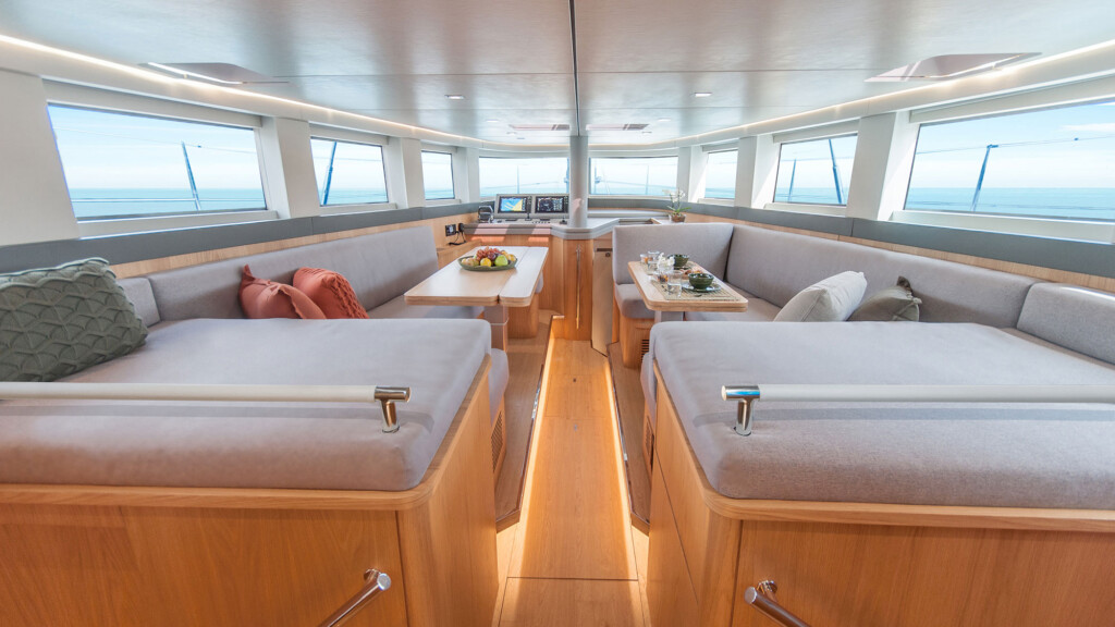 In fact, the deckhouse is clearly reminiscent of that of catamarans, tall and panoramic, with a hard cockpit cover that is also reminiscent of the cat world. Inside, the design is very reminiscent of that of powerboats, including the positioning and style of the interior command station.