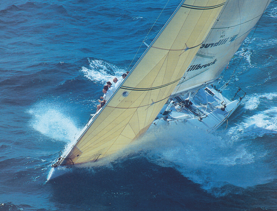 Judel and Vrolijk met in the IOR Quarter-Ton and Half-Ton circuits of the 1970s. With a good deal of experience behind them and several contacts, they founded judel/vrolijk design (later judel/vrolijk & co) in 1978, with the aim of combining their skills in designing fast, high-performance boats. Their first assignment came with the Quarter Ton Cup: Judel, already chief measurer of the German Sailing Federation, and Vrolijk, who had honed his skills in naval engineering and OK Dinghy racing, designed in 1978 the Quadriga, a Quarter-Ton that competed in the world class. Working side by side, their fluid dynamic analyses resulted in streamlined hulls with fine bows, anticipating solutions that would revolutionize the IOR in a few years. The turning point came in 1979, when the German Sailing Federation asked them for advice for theAdmiral’s Cup team and prospective owners entrusted them with the complete hull design. Thus was born Düsselboot, named after the boat show that sponsored the project. In 1983, renamed Outsider, she became part of the GermanAdmiral’s Cup team. Despite a dramatic mast breakage during the 1981 Channel Race, forcing the crew to make overnight repairs and add a spreader order for the next race, Düsselboot proves she can compete at the highest level.