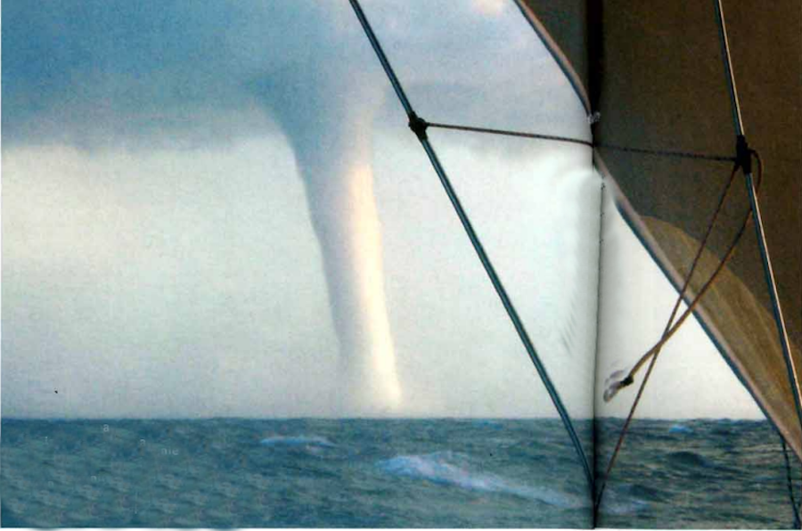 Per tutta la settimana precedente la partenza i cieli di Miami non avevano promesso niente di buono. Qualcosa nell’aria stava cambiando: correnti di aria calda e umida attraversavano sistematicamente la città per poi spostarsi verso il mare. D’altronde la stagione degli uragani era alle porte e noi dovevamo quindi affrettarci a partire. Memore d’insegnamenti di marinai più esperti di me, decido di salire verso Nord per cercare i margini delle basse pressioni e metterci quindi nella condizione di avere del vento sempre portante. La prima settimana troviamo venti deboli da Nord-Est e risaliamo di bolina stretta verso Nord con l’obiettivo di raggiungere il 1° parallelo, il tutto senza pilota automatico. È il primo di agosto: passiamo Cape Hatteras, un luogo funesto a detta degli appassionati americani per via del fatto che lì molte barche sono colate a picco. La fatalità è che proprio da qui che comincia “l’avventura” nell’avventura. I groppi sopra di noi s’intensificano di ora in ora: decidiamo di ridurre tela e prendiamo due mani alla randa, a prua teniamo yankee e trinca. Il cielo è strano, sembra carico d’energia. Le nubi cominciano a circolare in senso antiorario, s’incupiscono e si accendono di un rosso fiammeggiante ma non è né l’alba né il tramonto. L’aria rinfresca e la barca risponde bene. Procediamo per il resto della giornata in direzione Est. Durante la notte aumenta il vento: arrivano 25 nodi N-NW con andatura 10° sotto il traverso. Si vola e si alza anche un onda strana. Non quelle che solitamente incontri in oceano ma corta e discretamente alta, in più frange.