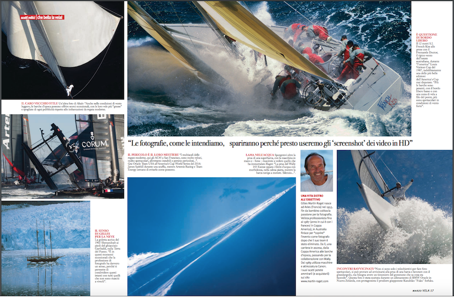 Trentacinque anni passati i prima linea. Iniziati con l’America’s Cup 1983 di Newport, quella dello storico successo di Australia II vissuta inizialmente da velista a bordo di France3 e poi d giornalista e fotografo alla prima esperienza professionale di rilievo. E ogg un presente di vela ultra veloce sui foil, foto in alta definizione e l’intera attività editoriale trasferita sul web, dopo la chiusura della galleria d’arte “L’Image en Provence” nel Vecchio Porto di Marsiglia Quella di Gilles Martin Raget è la storia d un uomo che ha avuto la fortuna di unire du grandi passioni – per l’immagine e per la vela – in un mestiere che nel corso degli anni l ha consacrato come uno dei più importanti fotografi di nautica nel mondo.