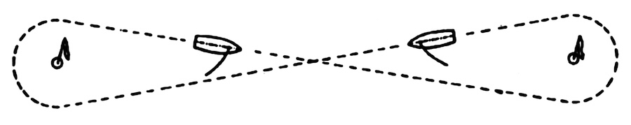 Girare le boe al meglio spesso fa guadagnare posizioni o ci libera per poter virare quando vogliamo. Per migliorarsi in queste circostanze esiste un esercizio fondamentale, che in gergo si chiama “8”, lo vedete nel diagramma dell’immagine sotto. Si tratta di un allenamento che coinvolge tutto l’equipaggio – da poppa a prua – con una serie di passaggi attorno a due boe messe a 30 metri circa di distanza a 90° con il vento. Si possono passare anche intere giornate in mare con questo allenamento, che permette di provare e perfezionare tutte le manovre, di virata e abbattuta, per far trovare la giusta alchimia al team di bordo.